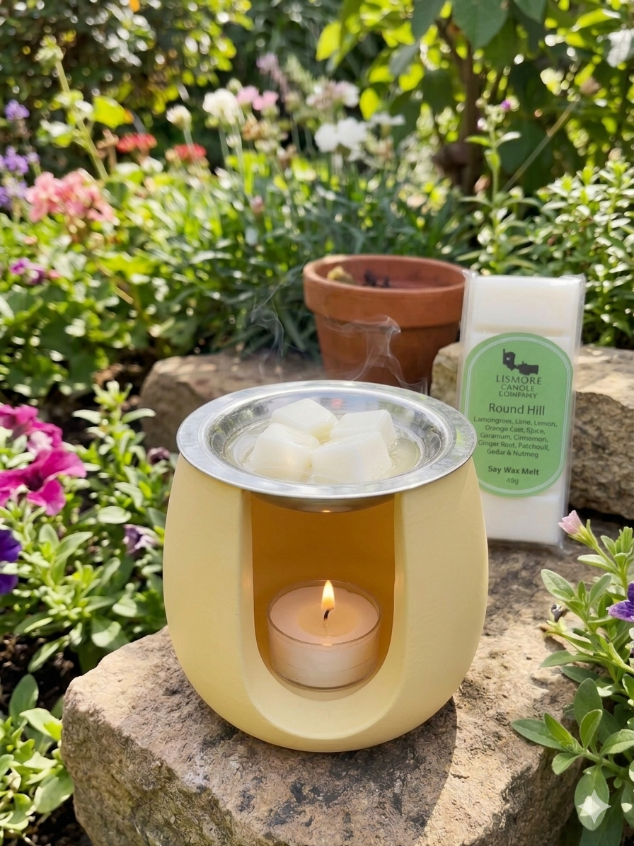 Light Yellow Wax Melt Burner Hand-made by Kerry from Jesmonite. A wonderful way to add colour and scents to your home. Place your T -Light inside and Light it, Add your chosen scent to the metal dish and the wax will behind to slowly melt.